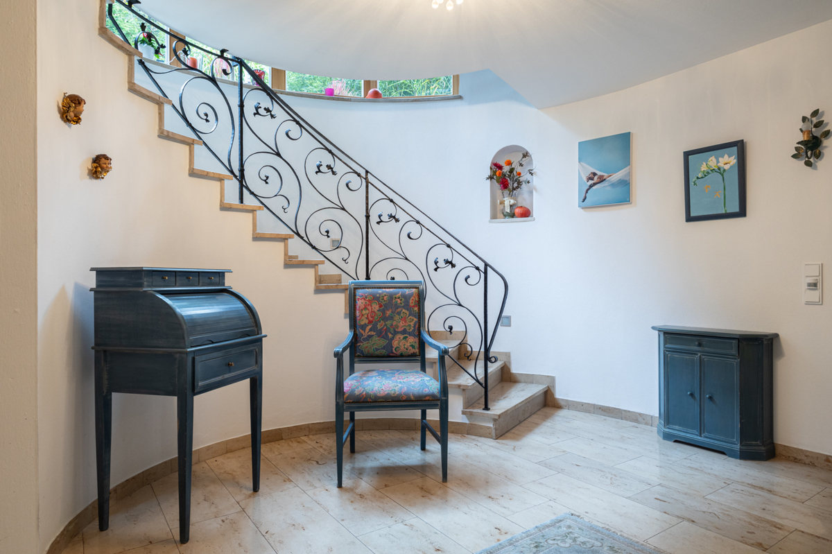 - Repräsentative Architektur mit verglaster, geschwungener Treppe als zentrales Designmerkmal