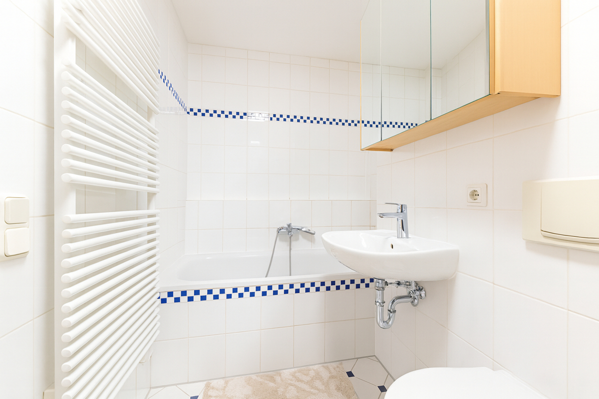 Tageslichtbad mit Wanne, Waschmaschinenanschluss und separatem Gäste-WC.