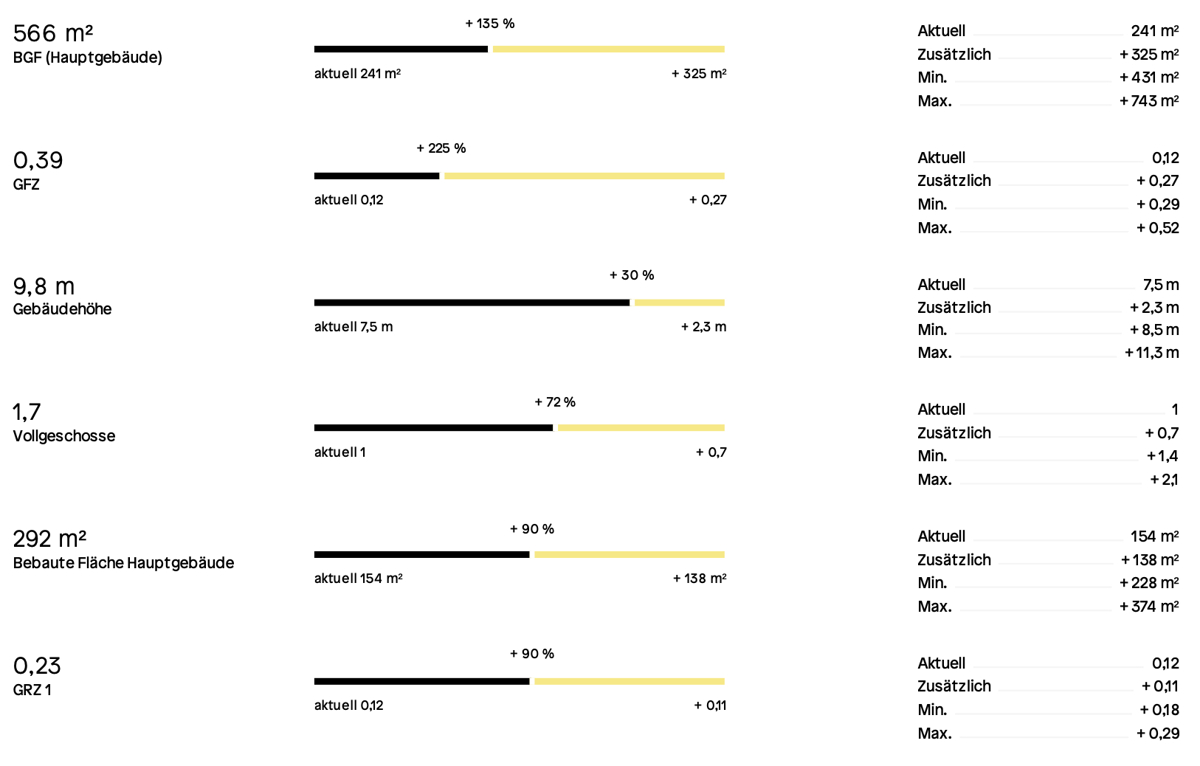 Das bestehende Architektenkonzept, das aktuell in Abstimmung mit der Gemeinde ist, kann auf dieser Grundlage verfeinert und weiterentwickelt werden. Eine potenzielle Erhöhung der BGF um +135 % gegenüber dem Bestandsgebäude eröffnet signifikante wirtschaftliche Spielräume für ein renditestarkes Neubauprojekt.