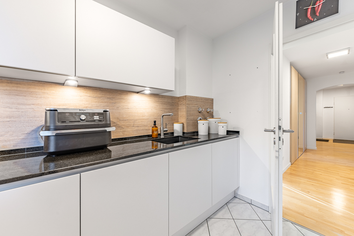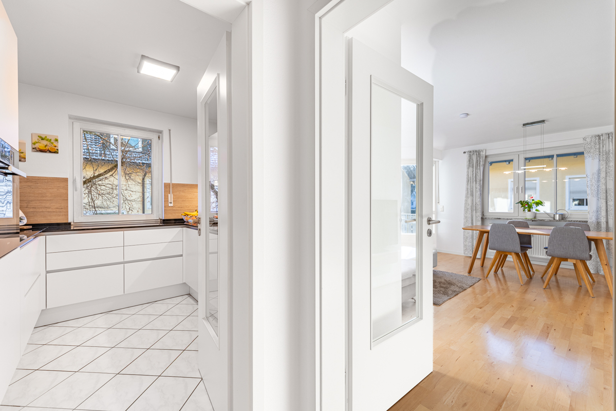 Die separate Küche ist modern ausgestattet und besticht durch hochwertige Markengeräte, darunter Miele. Zwei weitere Zimmer lassen sich flexibel als Schlafzimmer, Homeoffice oder Kinderzimmer nutzen – alle Räume wirken klar strukturiert, angenehm hell und äußerst gepflegt.