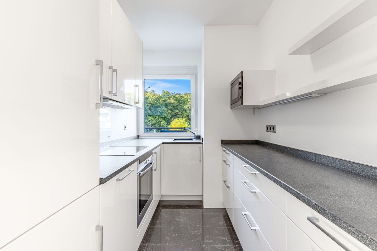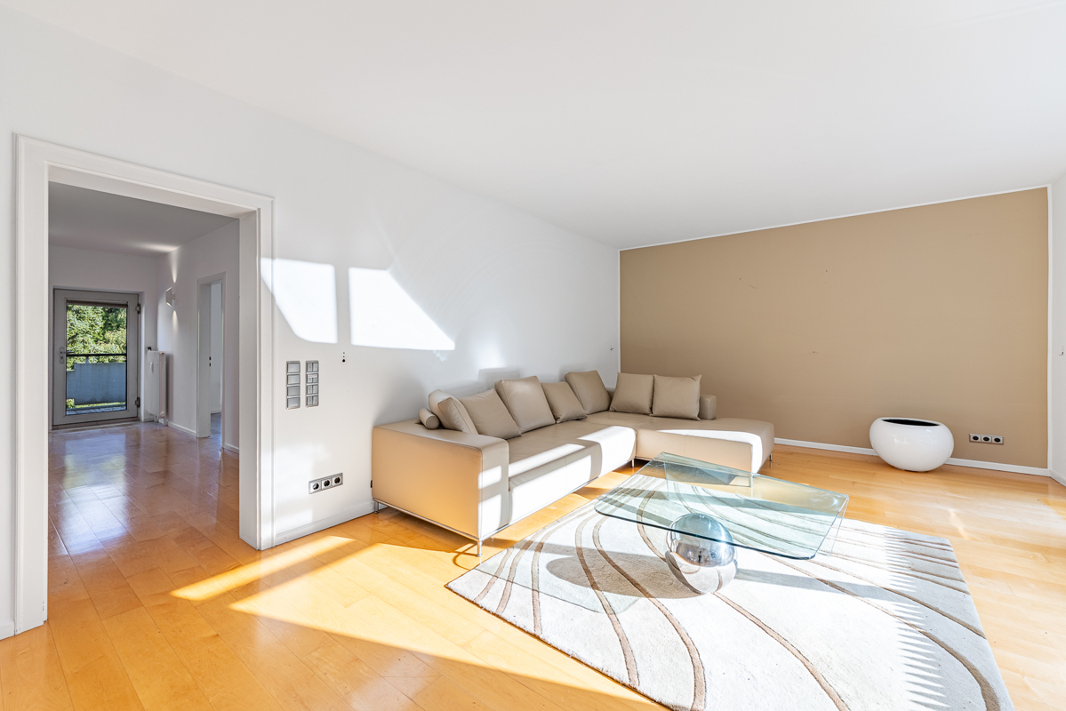Ein besonderes Highlight ist der unverbaute Blick in die gepflegten Gartenanlagen der Wohnanlage. Die Grünflächen vermitteln Ruhe, Weite und eine angenehme Distanz zum urbanen Umfeld – ein seltenes Zusammenspiel aus Stadtleben und naturnahem Wohnkomfort.